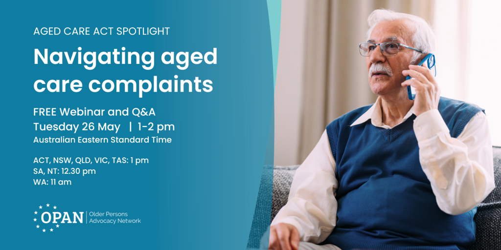 Every older person has the right to quality aged care – and the right to speak up when they’re not getting it. In this OPAN webinar, our panel of experts will discuss the aged care complaints process. Including what’s changed under the new Act, the role of mediation in resolving complaints, what to do if your rights have been breached, and how to seek a review of a decision. We’ll also explore the expanded powers of the new Complaints Commissioner and what they mean for older people.